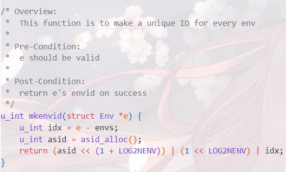 由以上 mkenvid() 函数可知,最终返回值的第 11 位始终为一,所以该函数不会返回零,因此不会存在 0 这个 envid,所以 envid2env 中如果是 0 则返回 curenv 功能才能够实现,IPC 部分才可以使用 envid2env 获取当前进程、根据进程 ID 获取进程结构体